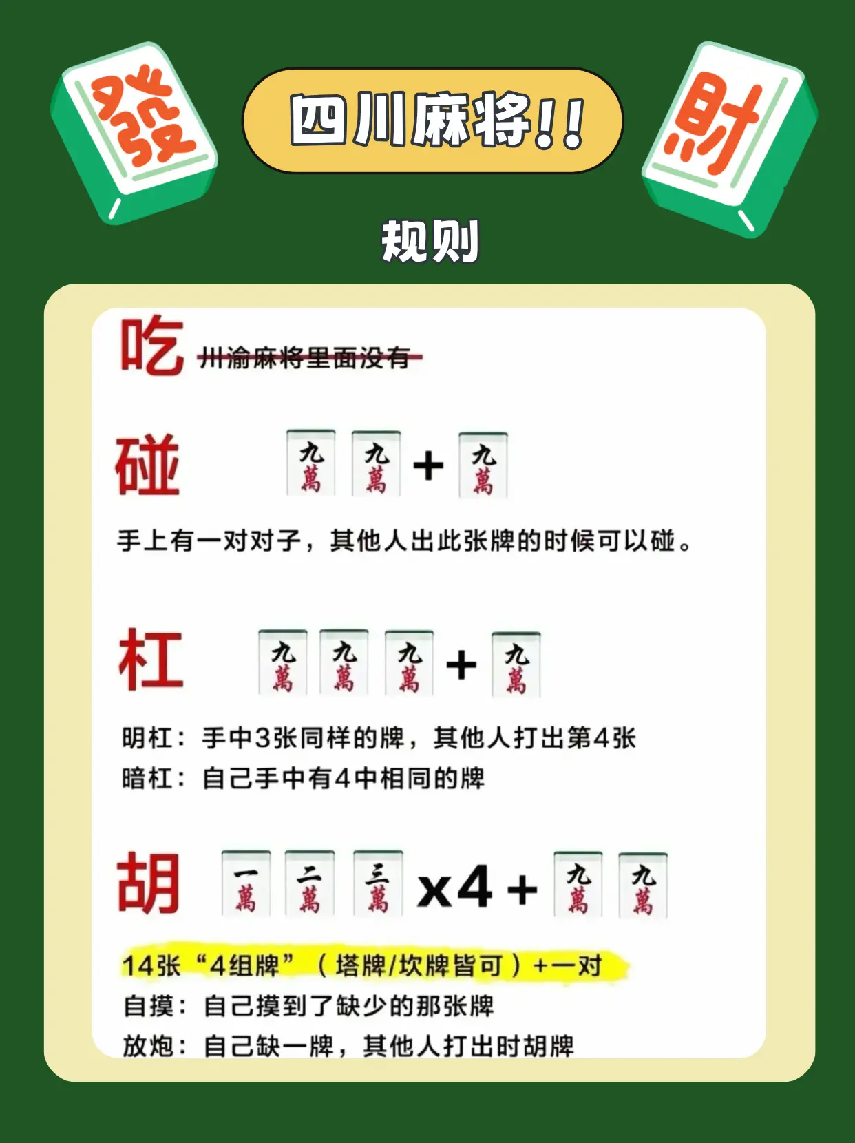 川麻最大的特色是快节奏、少牌多杠。通常使用108张牌(不含风牌或花牌),牌局节奏快速,出牌顺序紧凑。川麻的计分方式偏向高番,胡牌难度适中,但一旦胡牌,番型往往较高。