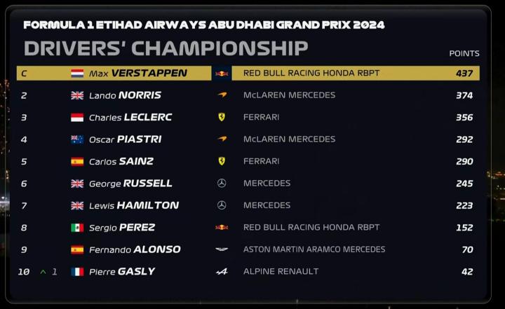 F1车队积分由两名正式车手在正赛与冲刺赛中获得的积分相加而成。这一机制意味着: